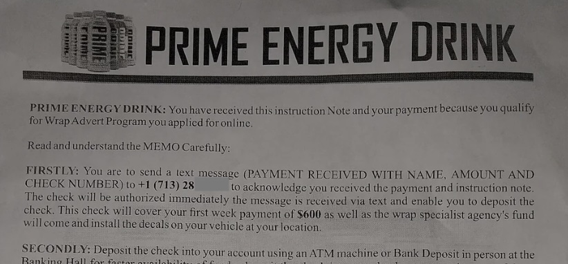 The next day, Marcus received a check for $3,200. Instructions were to deposit the check, keep $600 as his first week’s pay, and send the remaining $2,600 to a certified installer.
